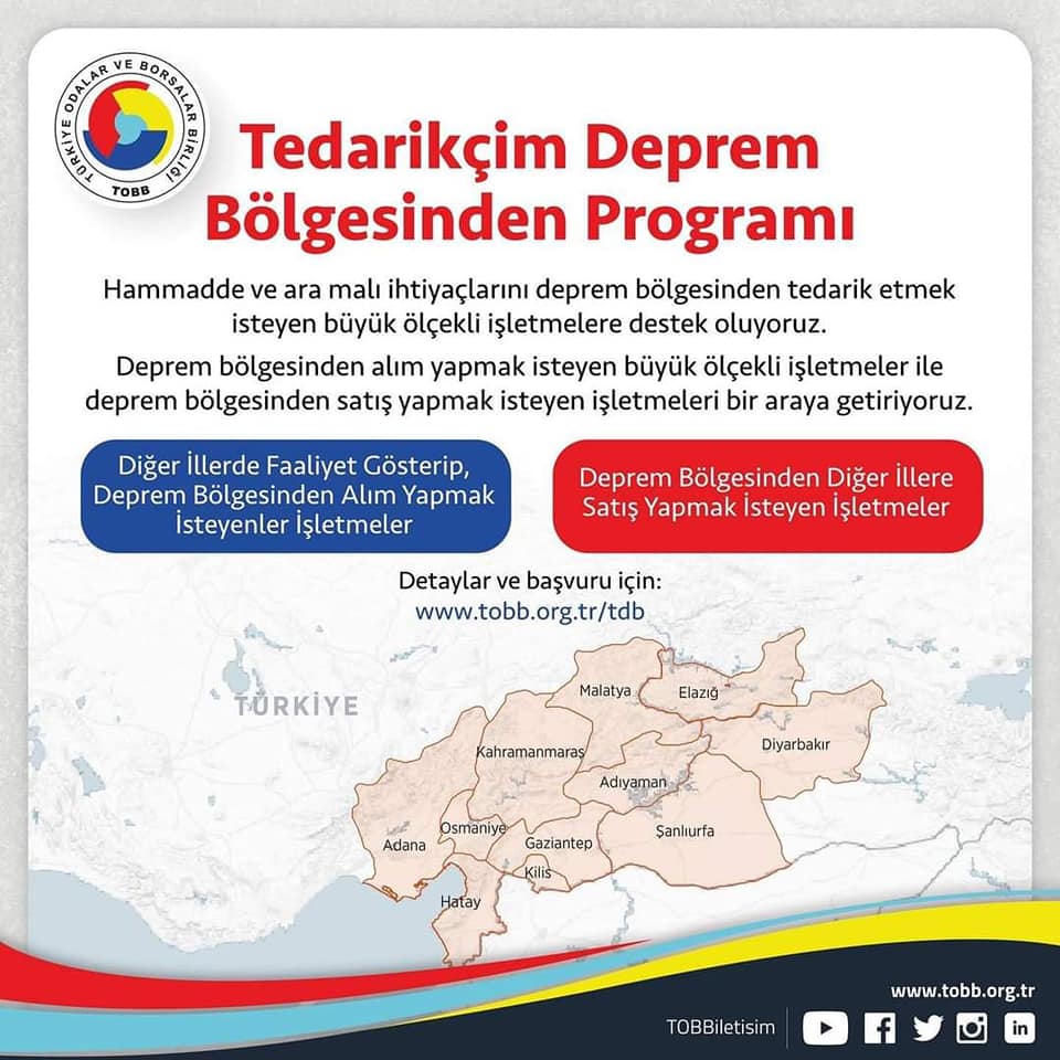 Tüm işletmelerimizi, hammadde ve ara malı ihtiyaçlarını TOBB Sanayi Veritabanı aracılığı ile deprem bölgesinden karşılamaya davet ediyoruz.