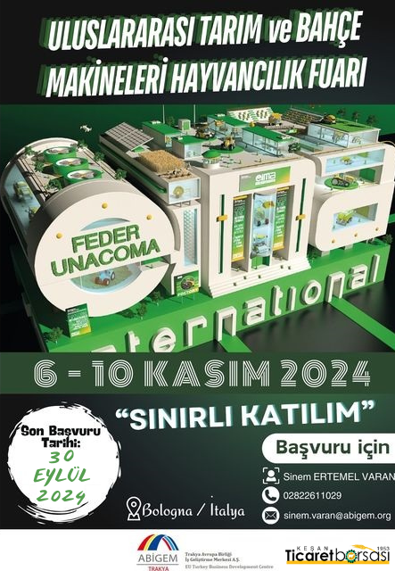 Borsamızın iştiraki olan Trakya ABİGEM Oda ve Borsalar üyelerine özel, 06 - 10 Kasım 2024 tarihlerinde İtalya-Bologna Uluslararası Tarım ve Hayvancılık Fuarı düzenliyor.