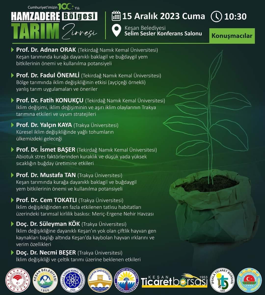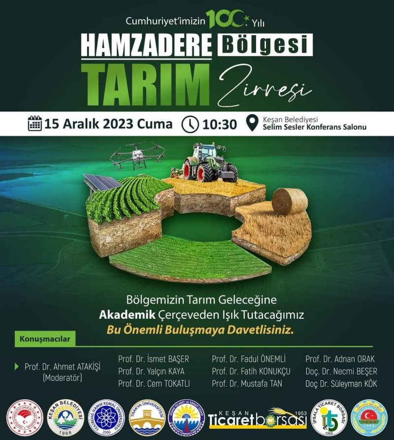 Keşan Kaymakamlığı, Keşan Belediyesi, Tekirdağ Namık Kemal Üniversitesi, Trakya Üniversitesi, Borsamız, Keşan TSO, İpsala Ticaret Borsası, Keşan Ziraat Odası, İpsala Ziraat Odası ve Enez Ziraat Odası işbirliği ile düzenlenecek olan Cumhuriyet’imizin 100. Yılı Hamzadere Bölgesi Tarım Zirvesi’ne davetlisiniz.