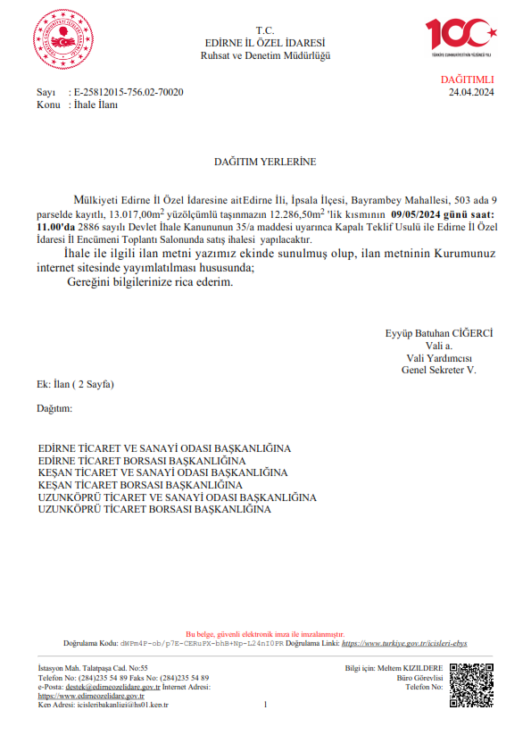 Edirne İl Özel İdaresine ait aşağıda bilgileri bulunan taşınmaz 2886 sayılı Devlet İhale Kanunu’nun 35/a maddesi uyarınca “Kapalı Teklif Usulü ” ile 09/05/2024 tarihinde satış ihalesi yapılacaktır. İdare, ihale gününe kadar ilanı yapılan işlemin ihalesinden vazgeçme hak ve yetkisine sahiptir.