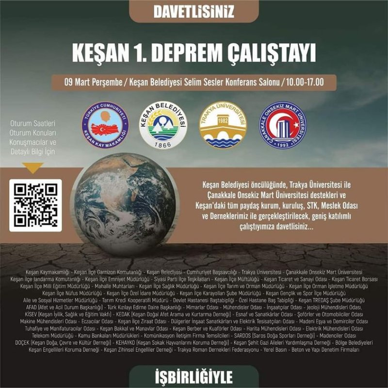 KEŞAN KAYMAKAMLIĞI, KEŞAN BELEDİYESİ, TRAKYA ÜNİVERSİTESİ VE ÇANAKKALE 18 MART ÜNİVERSİTESİ İŞBİRLİĞİ İLE KEŞAN’DAKİ TÜM KAMU KURUM VE KURULUŞLARI, STK’LAR VE DERNEKLERİN KATKILARIYLA DÜZENLENEN “KEŞAN 1. DEPREM ÇALIŞTAYI” BÖLGEMİZE VE TÜM TÜRKİYE’YE HAYIRLI OLSUN