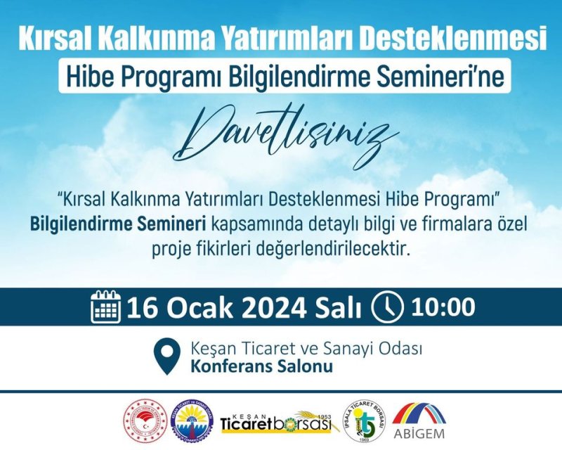 Edirne İl Tarım ve Orman Müdürlüğü, Keşan Ticaret Borsası, Keşan Ticaret ve Sanayi Odası, İpsala Ticaret Borsası ve Trakya ABİGEM işbirliğinde düzenlenen, "Kırsal Kalkınma Yatırımları Desteklenmesi Hibe Programı"na davetlisiniz.