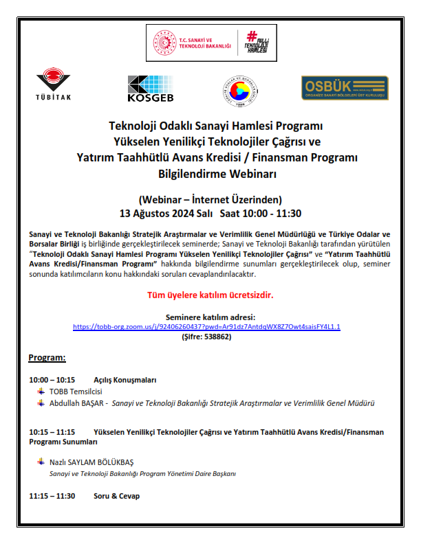 Teknoloji Odaklı Sanayi Hamlesi Programı Yükselen Yenilikçi Teknolojiler Çağrısı ve Yatırım Taahhütlü Avans Kredisi/Finansman Programı bilgilendirme webinarı